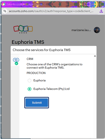 10. A pop-up will open to ask for access to the users 3rd party account. Select the correct company CRM and Select Submit.