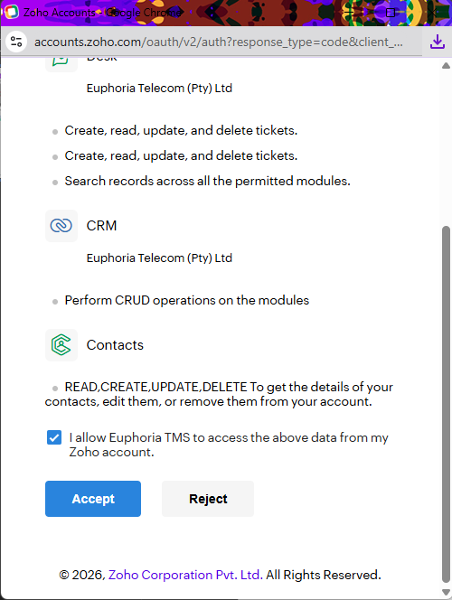 11. A second page will appear and ask to be allowed to access data from the account. Tick the allow box, and select Accept.