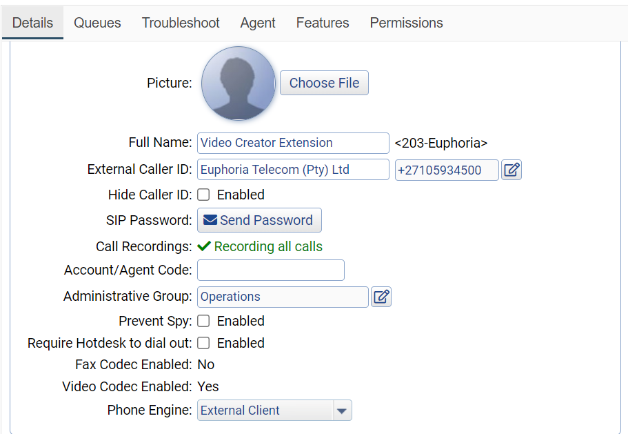 Call Recordings: Shows if the extension has call recordings enabled. This item ONLY shows when the feature is enabled.