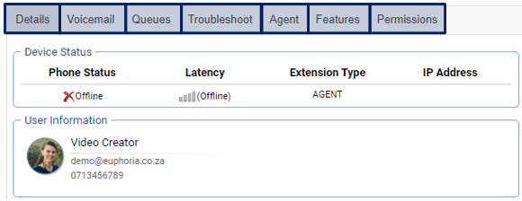 Underneath this is the user Information. The user is the staff member who is associated with the extension. The details seen here are: