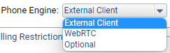Phone Engine: To log in to the Agent Workspace, the agent will need a phone engine to transport the calls between the workspace and the server. Two such engines are available, the External Client or WebRTC. When one of these options are chosen, the agent will not be able to change the engine within the agent workspace. A third possibility is available called “Optional”, and this allows the agent to choose which engine to use when they are in the agent workspace.
